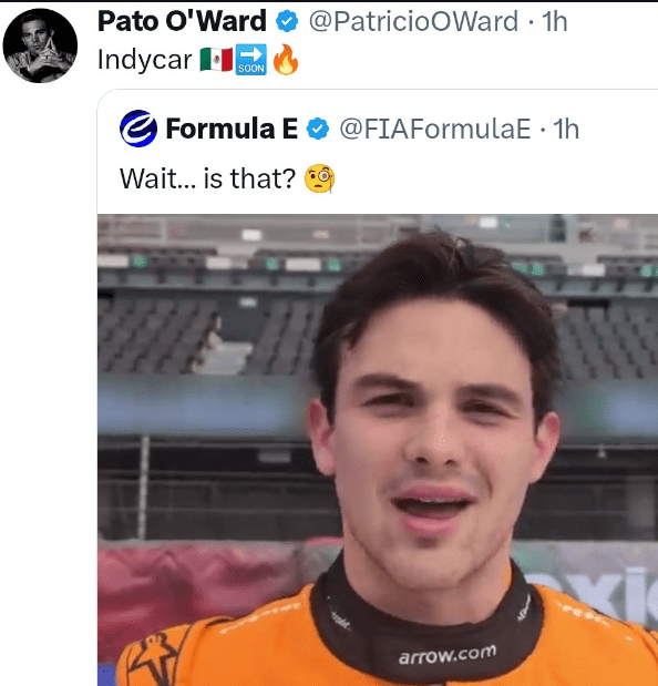 Después de su participación como piloto de pruebas del equipo McLaren en la Práctica 1 del Gran Premio de la Ciudad de México, el piloto Mexicano Patricio (Pato) O’Ward apareció el día de hoy dando un misterioso mensaje en la cuenta oficial del campeonato mundial de la ABB FIA Formula E.