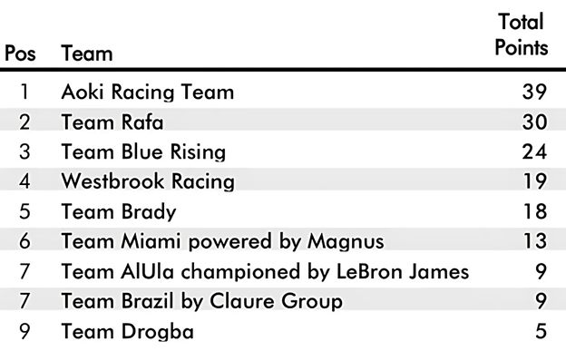 Por otro lado, debido a los problemas con su Racebird en la fase temprana del GP, el Team Drogba se encuentra actualmente en el fondo de la tabla.