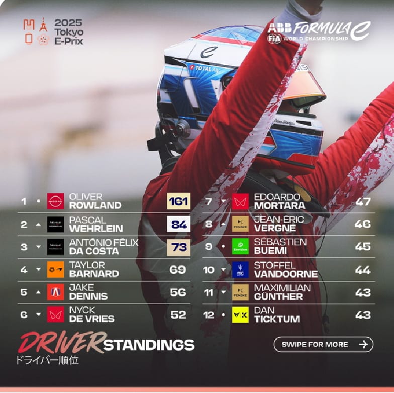 Si bien matemáticamente (y por tradición) no puede descartarse un adelantamiento del equipo TAG Heuer Porsche, tanto en el campeonato de equipos como en el de pilotos, es cada vez más complicado que, el campeón del 2024 Pascal Wehrlein, o su compañero Antonio Félix da Costa, acumulen los puntos suficientes para emparejar los 77 que Rowland les lleva de ventaja.